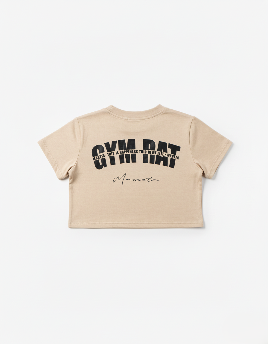 El crop top beige mujer es una pieza maestra de estilo minimalista. Su color, que recuerda a la arena y a los elementos naturales, proyecta una imagen de calma, seguridad y una fuerza orgánica. Este tono atemporal funciona como un fondo perfecto que hace resaltar la audaz declaración «GYM RAT» en la espalda, creando un equilibrio visual único entre sutileza y carácter. Es una prenda que habla de una confianza madura, de saber que el trabajo duro es el mejor accesorio. El delicado logo de Maxeta en el pecho es el único sello que necesitas para certificar que vistes una pieza de calidad superior.