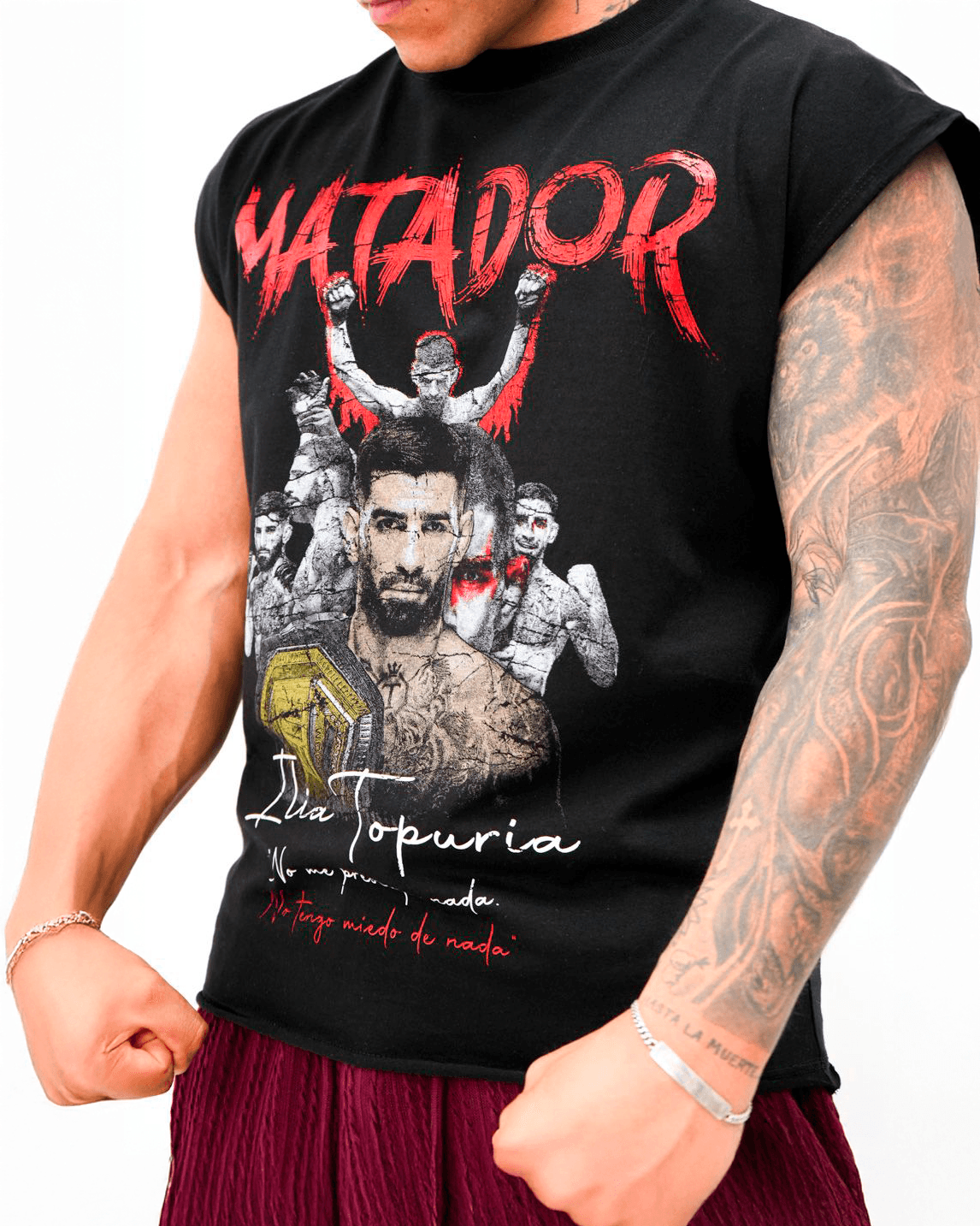 Esta no es una prenda para los que siguen. Es para los que lideran. El color negro es la declaración de poder, pero la verdadera historia está en el gráfico: «MATADOR», un collage del campeón Ilia Topuria y su lema. Es el fit «Sleeveless» (manga cero), diseñado para el confort en la calle y para lucir la disciplina de un «Gym Rat».