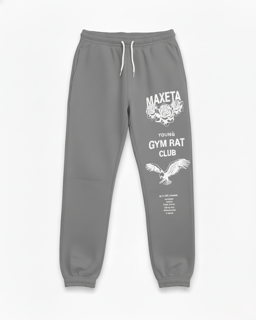 Esta no es una prenda para los que siguen. Es para los que lideran. El color gárgola (gris oscuro) es la declaración de poder, pero la verdadera historia está en los detalles: los gráficos «Maxeta», «Young Gym Rat Club» y los emblemas del cráneo, la rosa y el águila, son la firma de una cultura. Es el fit clásico de jogger con puño, diseñado para el confort en la calle y el rendimiento en el gimnasio.